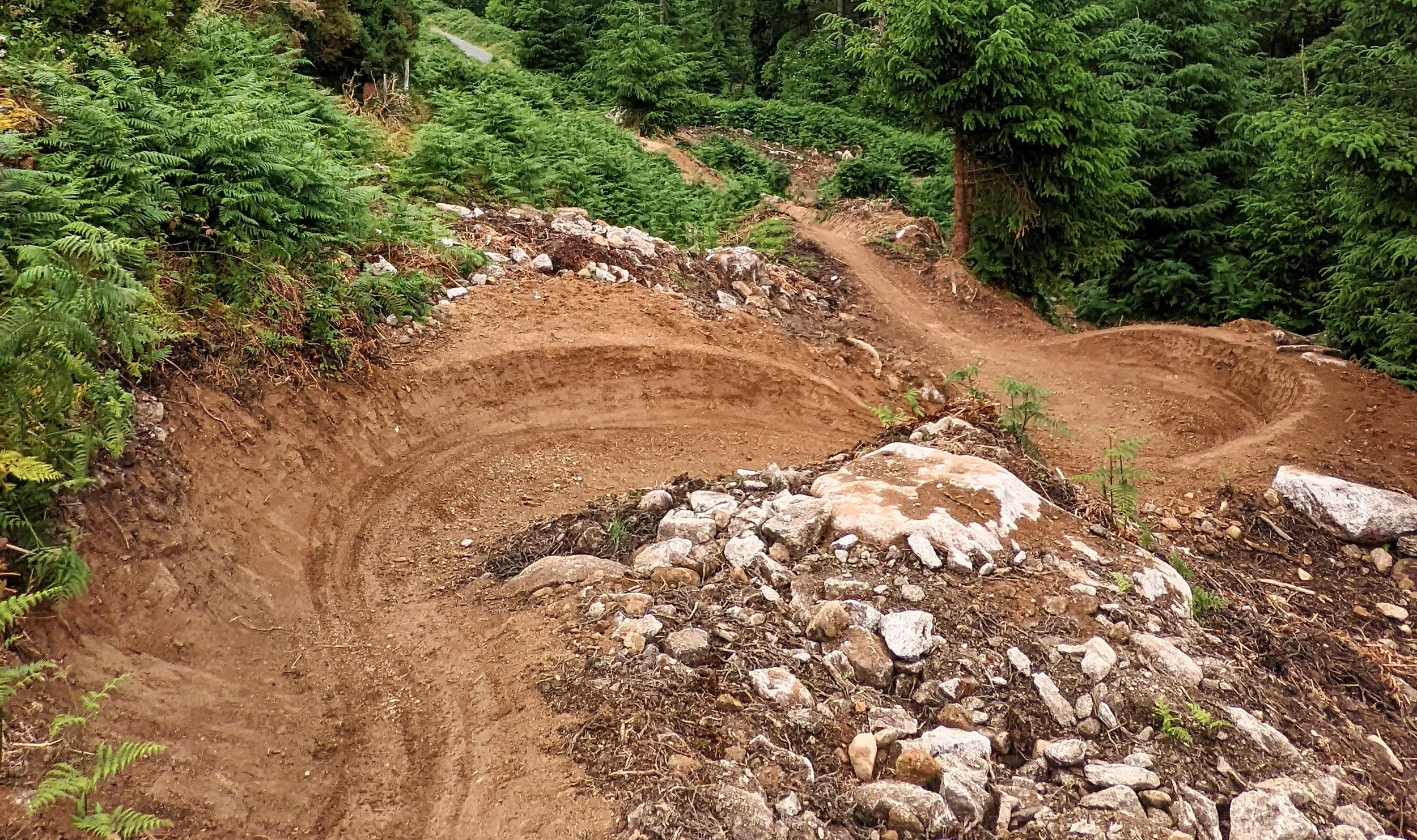 ticknock phase 2 was a large project to build 3 new black grade, 3 blue grade and 1 red grade trails. total kilometers of trail was approximately 6.5 kilometres. the black trails were a combination of flow style with larger jumps and steep berms to steep technical sections with natural rocks and roots. the red grade trail was a combination of flowy berms and tabltops with some more technical features like rock sections and tight twisty singletrack. the blue trails were fun flowy style trails with easy berms, pump rollers and nice easy gradient to keep the speed up without needing to pedal but minimal braking points.on this project we had some serious drainage issues with ground water and rocky difficult terrain, we overcame these issues with extra topside drains, a lot of storm pipes and land drain pipes. we dug better quality dirt from other areas of the mountain and imported it to the trail to deal with the rocky poor quality soil in some areas.